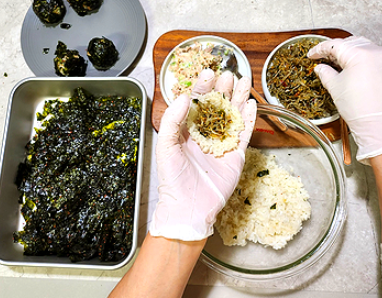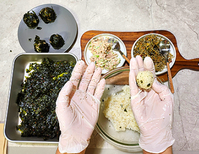 🔄 참치 무침을 올려 동그랗게 말아줍니다. 👊 4. 완성된 주먹밥을 썰어둔 김에 굴려 묻혀줍니다. 이때 밥을 꽉 쥐어주면 김이 잘 붙습니다. 🟢 5. 선택사항으로 참치 주먹밥 위에 고추냉이를 살짝 올려주면 색다른 맛을 즐길 수 있습니다.
