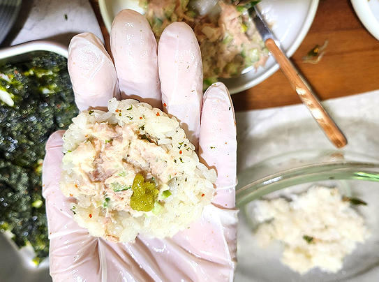 참치도 밥을 넓게 펴서 싸주어야 작고 깔끔한 주먹밥을 만들 수 있습니다. 🔄