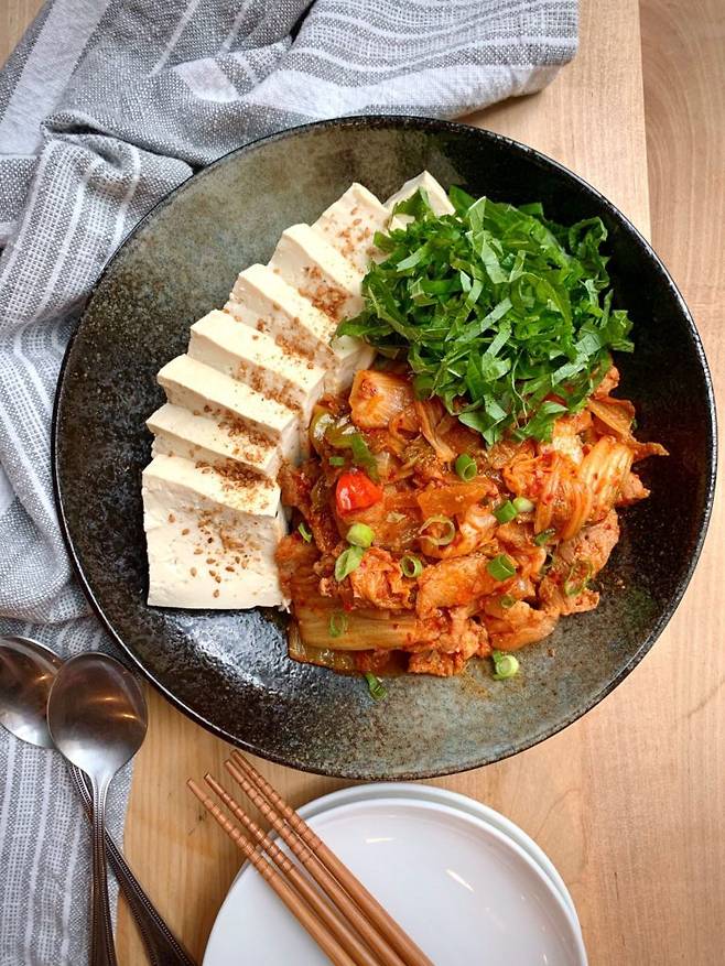 따끈하게 데운 두부 한 점 위에 매콤하게 볶아낸 김치와 고기를 올려 먹으면, 입안에서 부드러움과 감칠맛이 어우러져 속이 절로 풀리는 기분이에요.