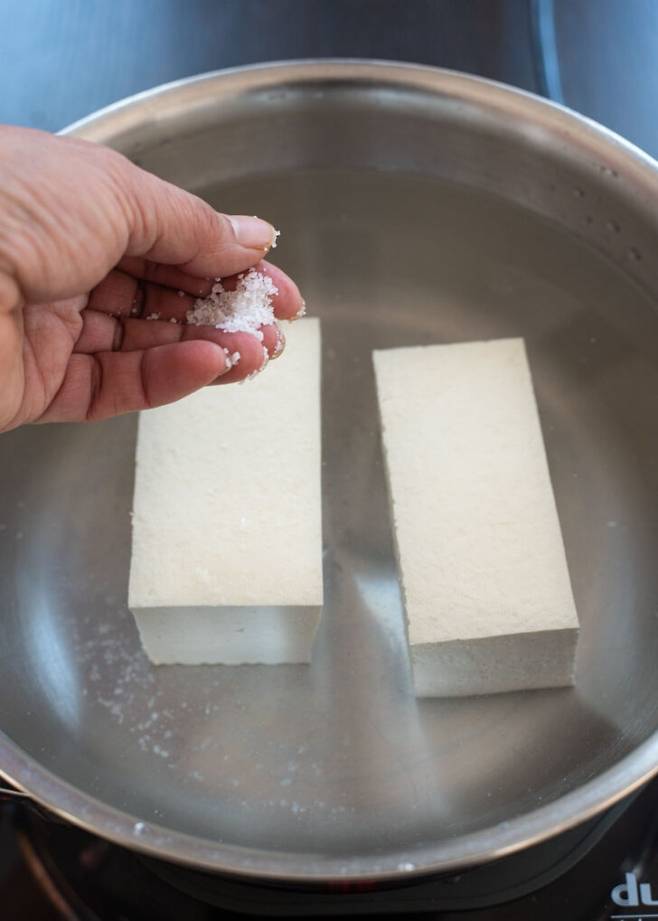 1. 두부는 끓는 물에 소금을 살짝 넣고 3~5분 정도만 데워요. 너무 오래 두면 부서지니까 시간 꼭 지켜주세요. 건져낸 두부는 따뜻하게 보관해둡니다.