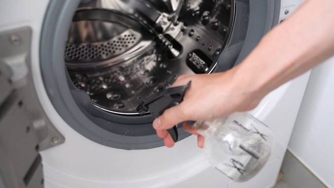 내부가 깨끗해졌다면, 이제 외부를 청소할 차례입니다. 식초와 물을 1:1 비율로 섞어 분무기에 넣어주세요. 이 혼합물을 이용해 세탁기 문과 고무패킹을 닦아볼 건데요, 문 안쪽과 고무 패킹에 식초물을 골고루 뿌리고 5분 정도 그대로 두세요.