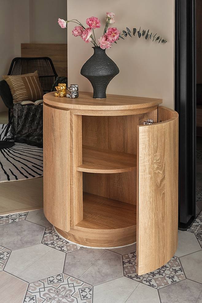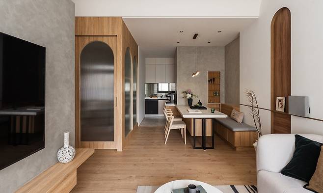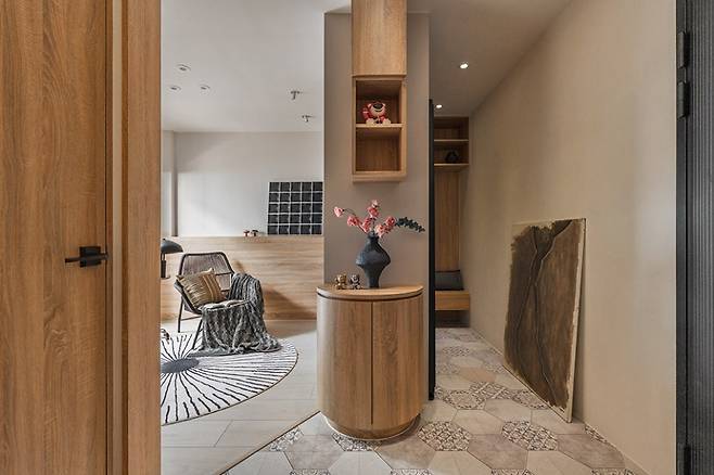 육각 타일과 원목 바닥의 대비, 곡선 수납장은 동선을 따라 자연스럽게 이어지며 여유로운 인상을 줍니다.