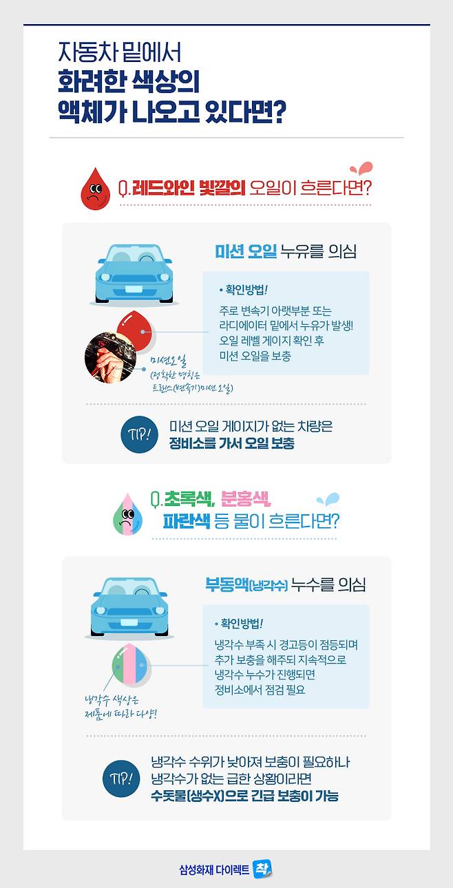 자동차 밑에서 화려한 색상의 액체가 나오고 있다면?