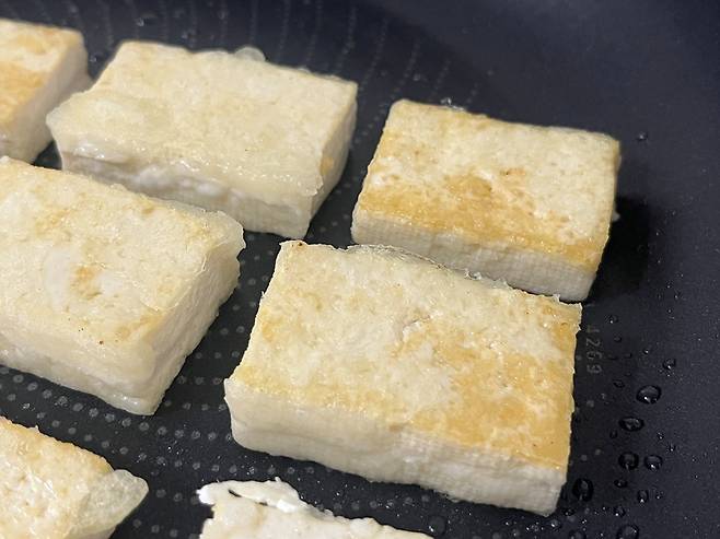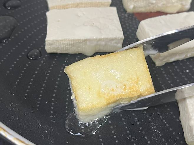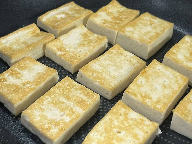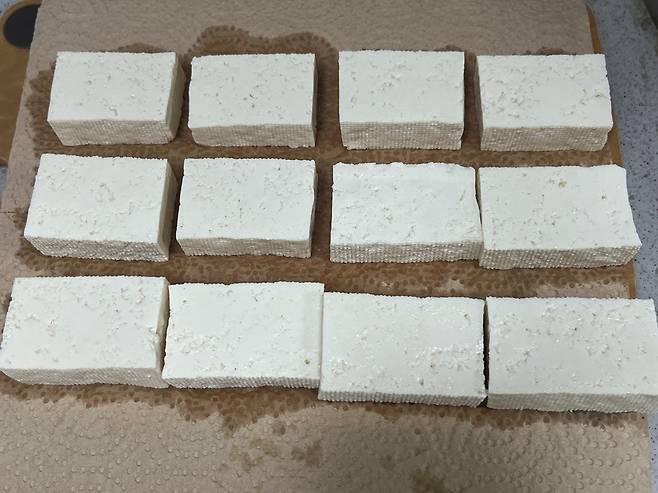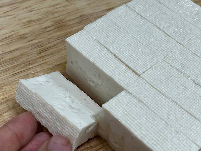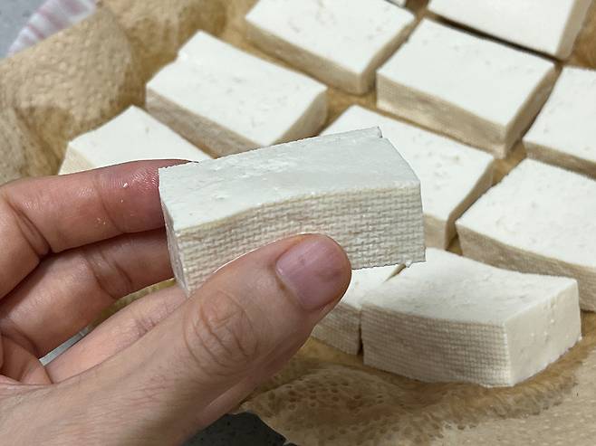 두부는 굉장히 많은 수분을 머금고 있는 식재료입니다. 겉으로 보기에는 단단해 보여도 속에는 물이 꽉 차 있는데요. 두부는 이렇게 썰어만 놔도 금방 수분이 표면으로 올라와 물기가 흥건해집니다.