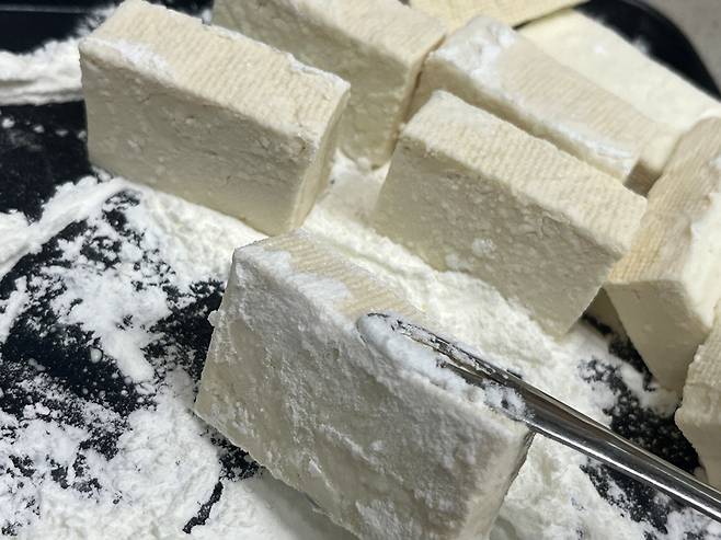 수분 제거까지 끝났다면 이제 전분을 살짝 묻혀주는 과정을 더해보세요. 두부 표면에 감자전분이나 옥수수전분을 얇게 코팅해 주면 전분이 남아 있는 잔여 수분을 잡아주기 때문에 튀김처럼 기름이 튀는 현상도 줄어들고, 구웠을 때 모양도 훨씬 단단하게 유지됩니다.
