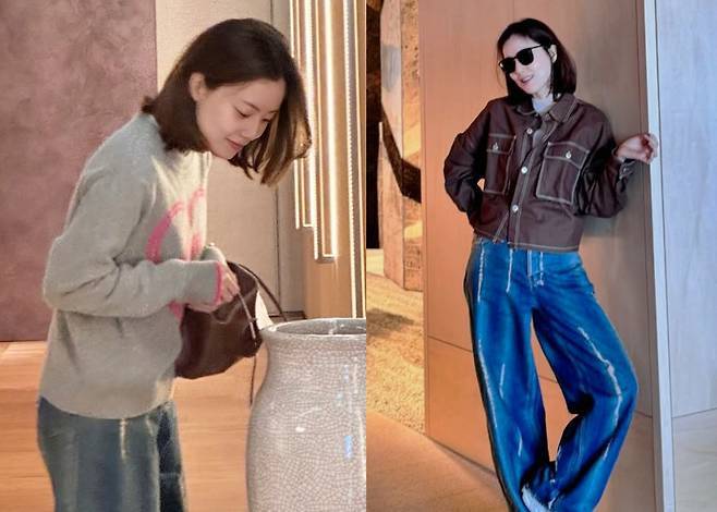 문채원은 캐주얼한 브라운 데님 재킷과 디스트로이드 디테일의 청바지를 매치하며 자연스러운 매력을 강조했습니다.
