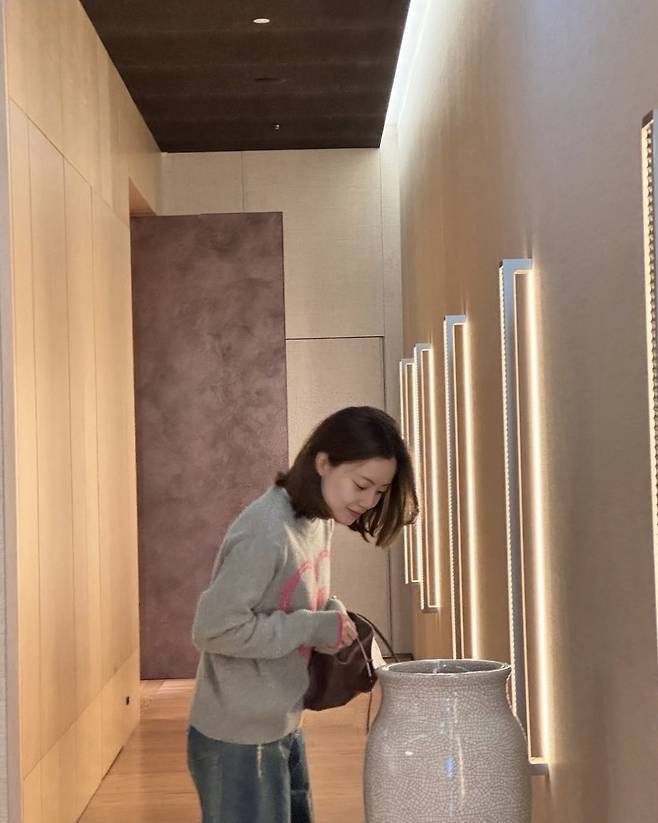 실내에서는 부드러운 니트 스웨터와 청바지를 조합해 따뜻한 분위기를 연출했습니다.