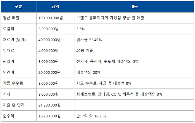 인건비는 월 매출의 20% 비중으로 설정했으며, 로열티는 월 매출의 3.3%가 발생합니다. 또한, 임대료는 40평 기준으로 월 400만 원으로 책정했습니다.
