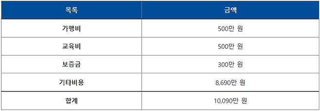 창업 비용에 대한 내용은 브랜드 홈페이지에서는 확인할 수 없습니다. 하지만 공정거래위원회 가맹사업거래 정보공개서를 토대로 확인했습니다.
