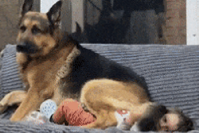 셰퍼드가 아기를 보호하기 위해 아기 위에 올라탄 상태가 되버렸습니다. 그렇게라도 아기를 자기 몸으로 보호하려는 모습입니다.