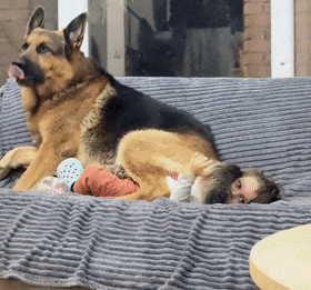 이것이 완전히 안전하다는 느낌인가요? 셰퍼드에 깔린 아기가 무척 답답해보이기는 하지만 수시로 셰퍼드는 아기를 돌아보면서 살피고 있습니다.