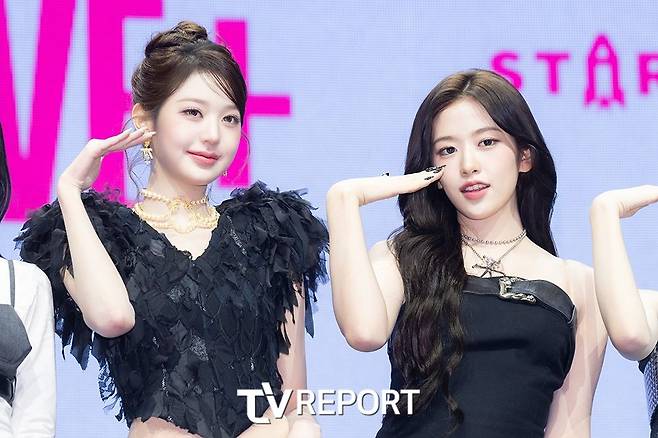 그룹 '아이브(IVE)' 장원영과 안유진이 23일 오후 서울 광진구 예스24 라이브홀에서 열린 정규 2집 '리바이브 플러스(REVIVE +)' 발매 기념 미디어 쇼케이스에서 포즈를 취하고 있다.