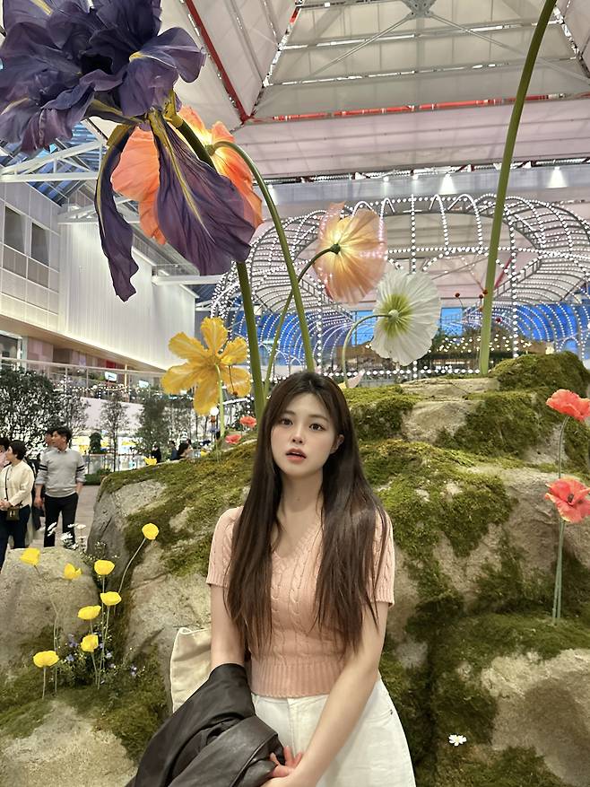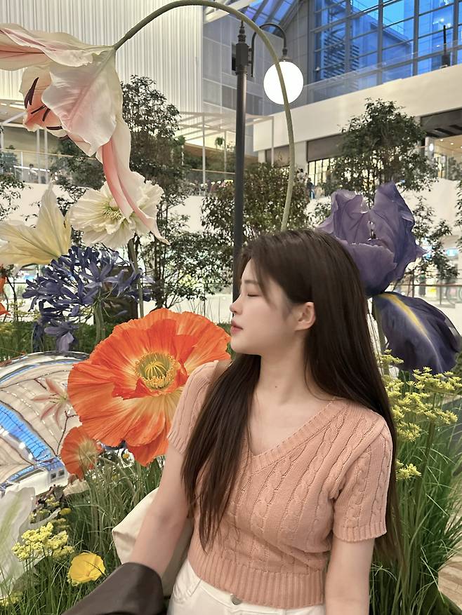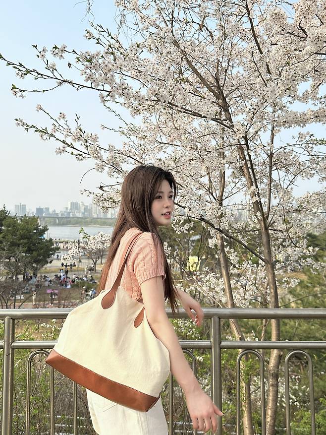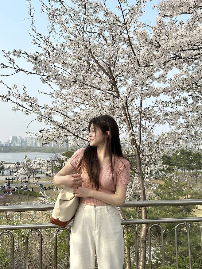 이날 벚꽃 구경 갈 때 핑크 컬러의 반팔 니트를 입어줬어요