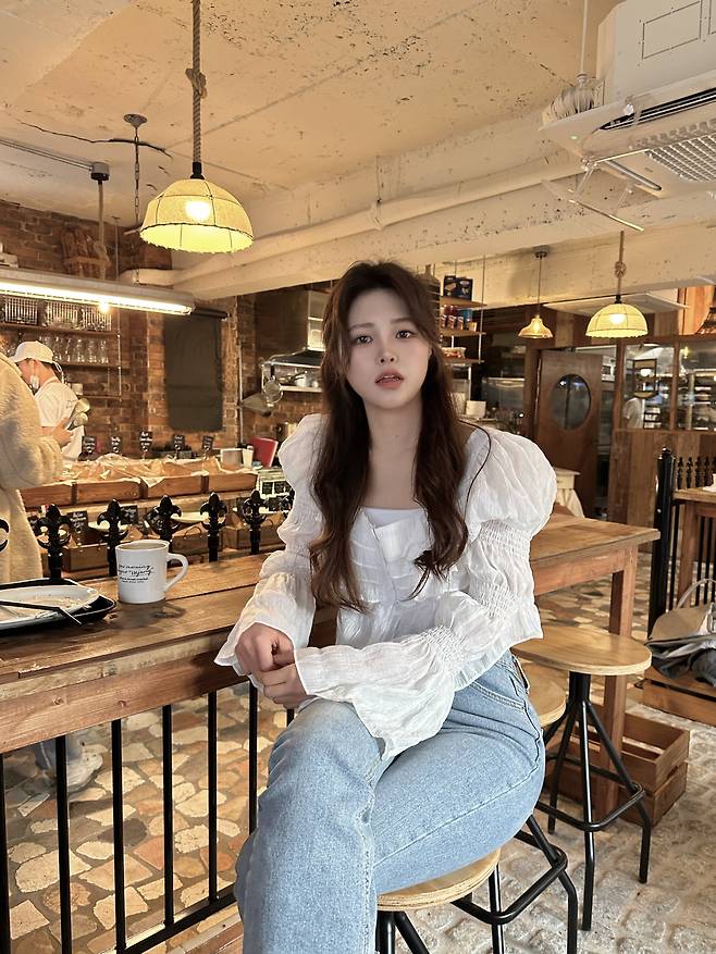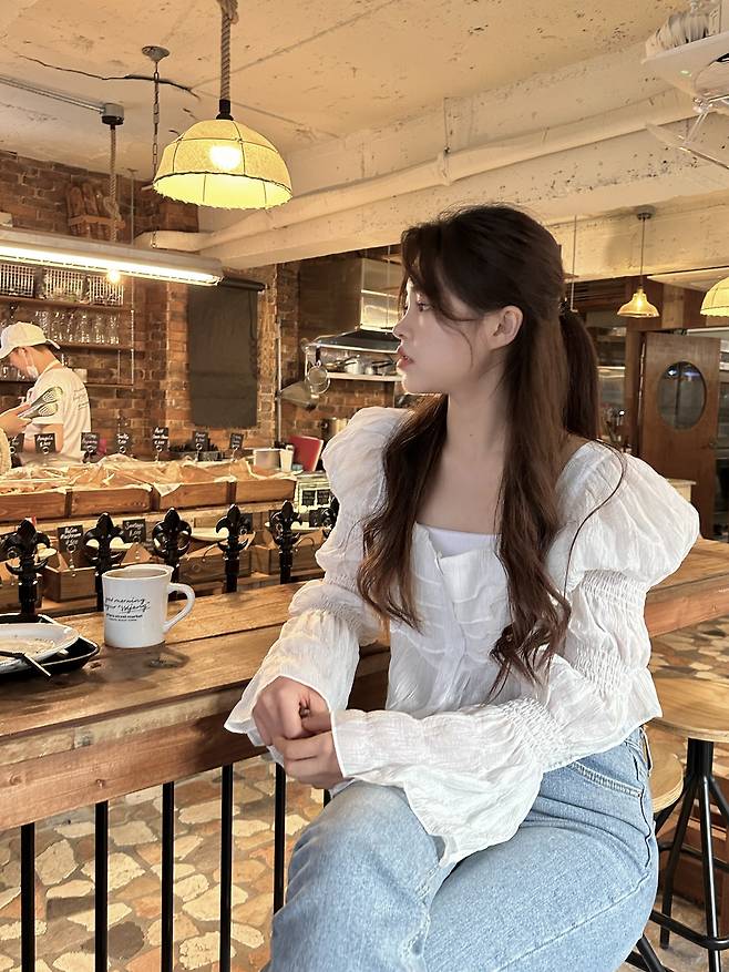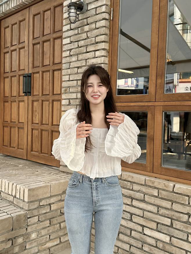 퍼프소매와 벨라인의 소매단이 팔뚝살을 커버해 주고