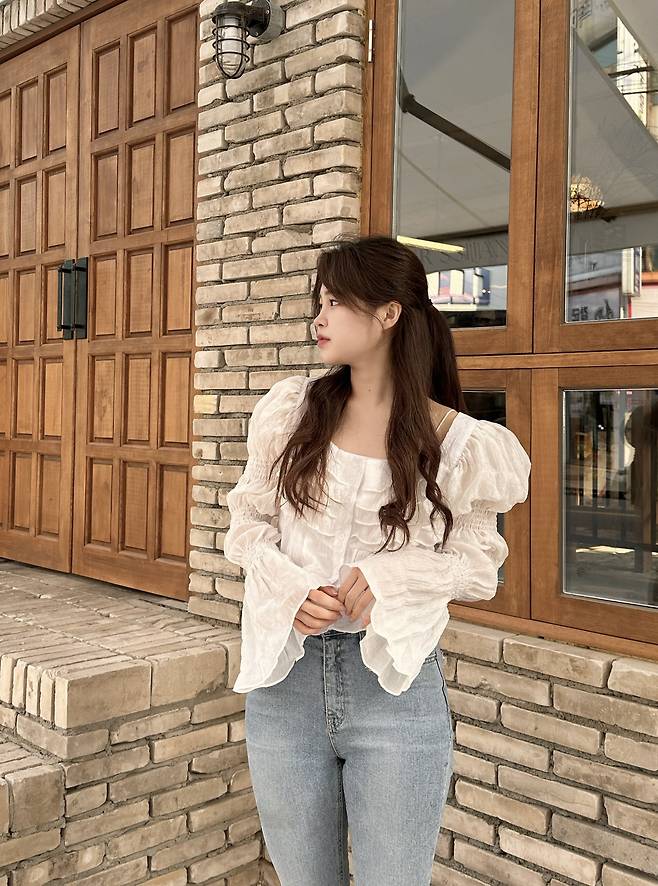 프릴과 셔링으로 디자인된 블라우스에요:)