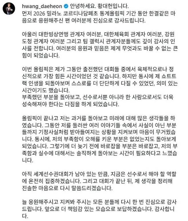 이제 공은 황대헌에게 넘어왔습니다. 나무위키 문서를 비공개로 돌린 '4월 16일'이라는 데드라인 안에 그가 어떤 입장을 내놓느냐에 따라, 그는 '억울한 피해자'로 복권될 수도, 혹은 '여론 조작 논란'에 다시 휩싸일 수도 있습니다. 밀라노 올림픽을 향한 빙판 위의 전쟁보다 더 뜨거운 '진실 공방'이 시작되었습니다.