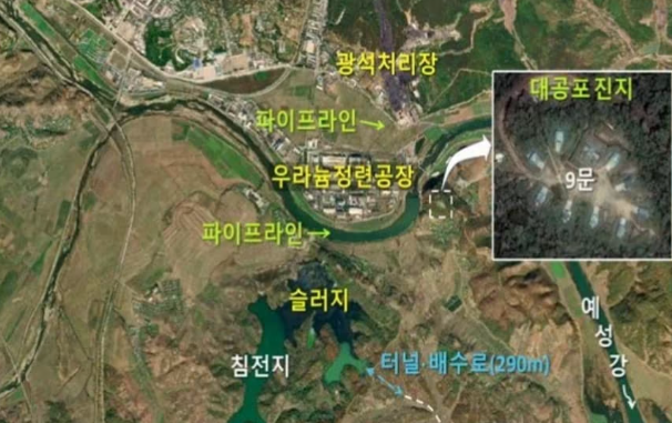 전문 분석기관에 따르면 평산은 우라늄 선별→파쇄→침출→침전→정광 생산 등 복잡한 공정이 이어지는 핵심 정제시설이며, 폐수는 강 건너 침전지로 흘려보낸다.