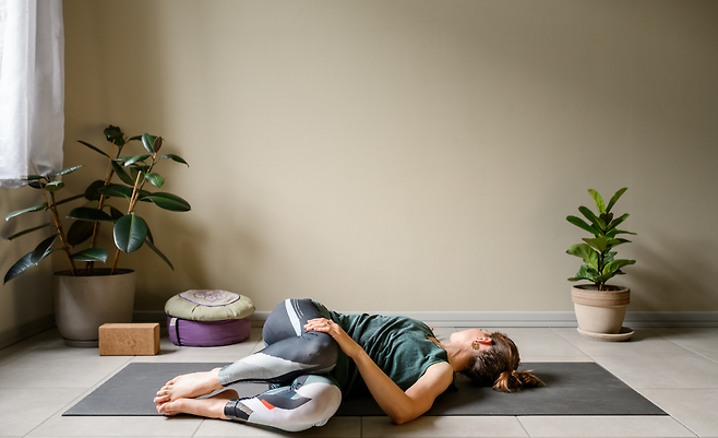 누운 상태에서 복부에 손을 얹고 깊게 호흡하는 연습을 합니다. 숨을 들이마실 때 배가 천천히 부풀어 오르고, 내쉴 때 배가 내려가는 것을 느끼며 복부 호흡을 반복합니다. 이 동작은 심신의 안정감을 주며, 스트레스 해소에 탁월한 효과를 발휘합니다.