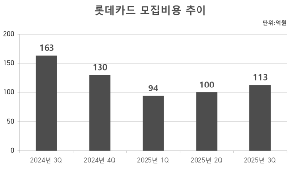 롯데카드의 재무 성과도 두드러진다. 작년 3분기 누적 기준 카드비용 중 모집비용은 307억원으로 전년동기(570억원) 대비 46.1% 감소했다. 롯데 생태계 중심의 PLCC 사업 전략이 비용부담 완화에 일부 기여했다는 평가가 나온다.