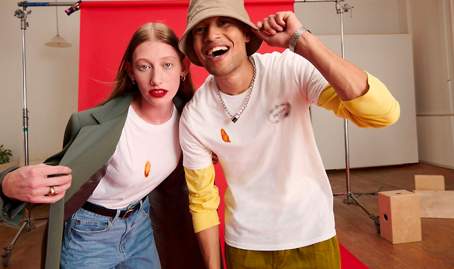 케첩 묻은 옷을 입고 핏을 자랑해요.