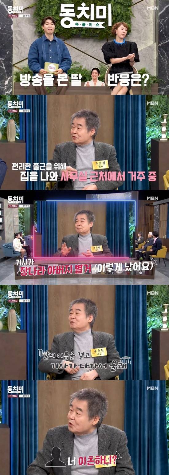 '동치미' 주호성이 지난 방송 출연 후 반응을 전했습니다. 장나라의 반응을 묻자, 그는 "내가 출퇴근 편의를 위해 사무실 근처에 거주하고 있다고 했더니 '장나라 아버지 별거라고 기사가 났다"라며 "내용은 별게 없는데, 그냥 제 이름으로 하지 왜 딸 이름으로"라고 불편함을 드러냈습니다.