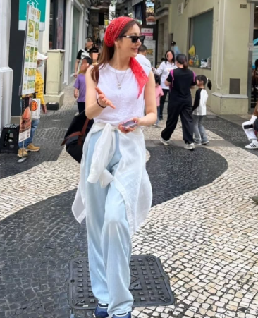 화이트 민소매 티셔츠에 하늘색 와이드 팬츠, 여기에 셔츠를 허리에 묶은 꾸안꾸 룩. 머리에는 레드 스카프를 두르고, 블랙 선글라스로 마무리한 이 스타일은 단정하면서도 발랄한 무드를 자아냅니다.