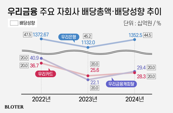 우리은행과 비교하면 우리카드·우리금융캐피탈 등 주요 자회사의 배당수익 기여도는 저조하지만 배당성향은 20% 안팎에서 관리되고 있다. 대표적으로 우리카드와 우리금융캐피탈은 순이익의 20%인 294억원과 283억원을 지주에 배당금으로 지급한다.