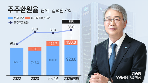 11일 금융권에 따르면 우리금융의 올해 주주환원율 예상치는 35.0%로 지난해(33.3%)보다 1.7%p 높아질 것으로 보인다. KB·신한·하나금융 등의 주주환원율이 40%를 웃도는 것에 비하면 아쉬운 수치다.