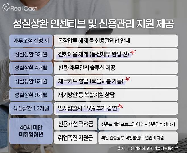 최초 채무조정 지원은 8~9월 중 시작한다는 계획입니다. 성실상환을 하면 인센티브가 분명한데요. 성실상환 기간에 따라 △3개월 통신서비스 이용 재개 △6개월 체크카드 발급(후불교통 가능)이 가능하고, △12개월 잘 갚고 일시 상환할 때는 15%를 추가로 감면해 줍니다.
