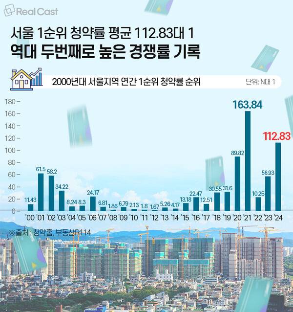 청약홈에 따르면 올해 서울에선 총 31개 단지가 분양에 나서 1순위 평균 경쟁률은 112.83대 1을 기록했습니다. 이는 2000년대 들어서 두 번째로 치열한 경쟁률이며 가장 경쟁이 치열했던 해는 2021년 이며 당시, 총 13개 단지가 분양에 나서 기록한 1순위 평균 경쟁률은 163.84대 1 이었습니다. 3년만에 세 자리 수 경쟁률을 기록한 셈입니다.