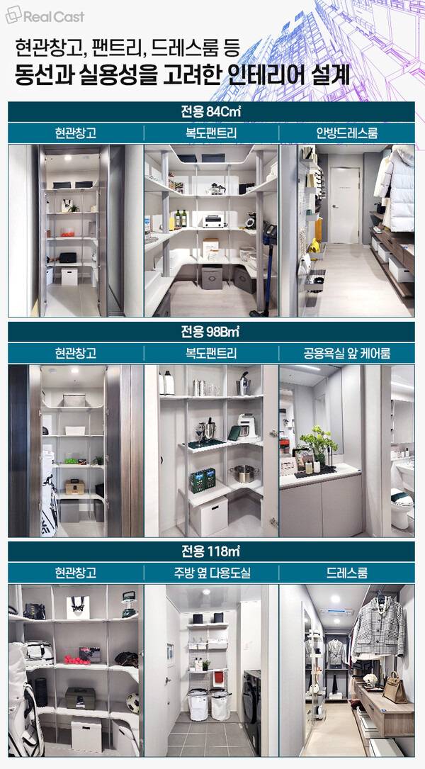 전용 118㎡는 3면 개방형으로 기본 3룸에서 4룸으로 선택 시 5베이 판상형 구조를 갖습니다. 넓은 현관을 따라 들어가면 현관창고가 한쪽에 있고, 주방 안쪽으로 있는 ‘ㄷ’자 형 창고와 안방 깊게 설계된 드레스룸 역시 여유 있는 수납과 공간 활용도를 높였습니다.