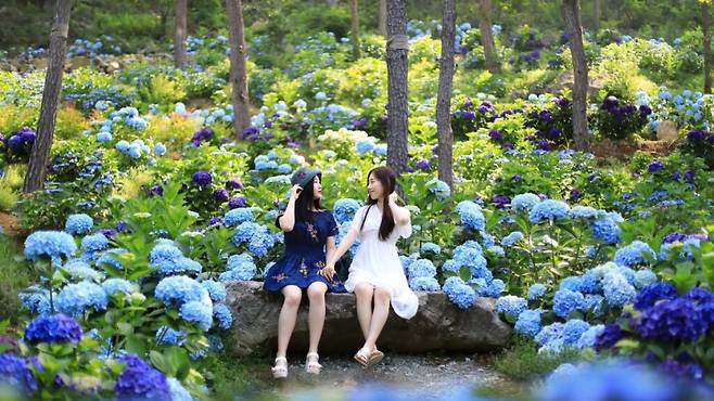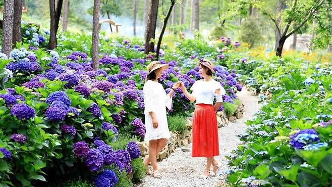 노랑, 분홍, 파랑, 보랏빛 등 형형색색의 수국이 숲길을 따라 끝없이 이어진다.