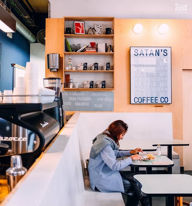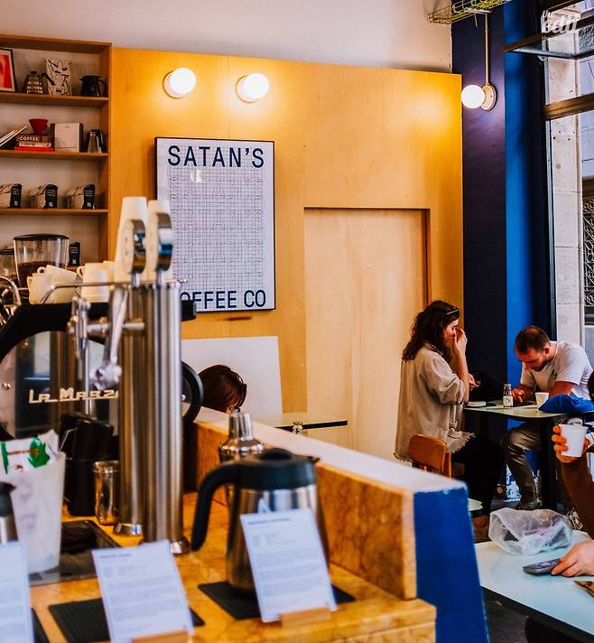 사탄 커피의 분위기는 커다란 통창과 오픈바와 같이 매장 전체가 깔끔하고 군더더기가 없는 느낌이었다. 이름에 대한 선입견인지, 바리스타의 접객태도가 그렇게 친절하지 않고, 와이파이가 없는 환경이지만, 전체적으로 매장의 분위기가 커피에 전념하는 느낌이었다. 사탄 커피는 고딕지구를 방문하는 현지 젊은이들에게 인기가 많다.