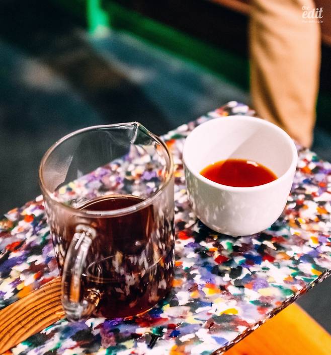 커피는 아메리카노와 브루잉 커피. 노마드의 아메리카노는 사탄커피보다 가볍고 향미에 초점이 있는 커피였다. 쓰리막스 커피의 향미와 밸런스가 좋았다면, 노마드는 발효취까지 포함한 다양한 향미가 강렬하게 발현되는 느낌이었다. 노마드 커피의 브루잉 커피(드립커피)는 케냐 싱글오리진.