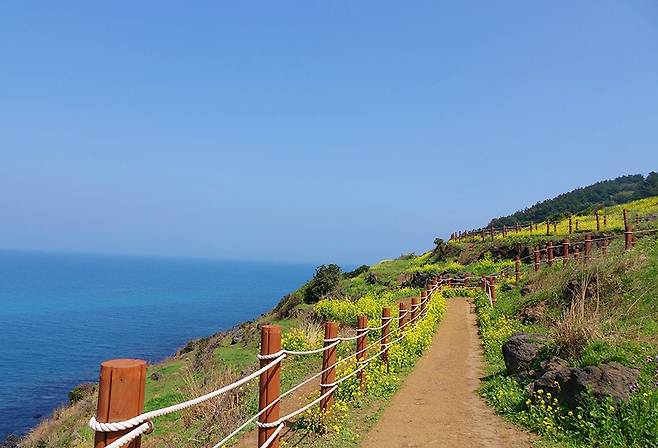 둘레길을 따라 걷다 보면 탐방로 양옆으로 유채꽃이 이어지며, 꽃밭 너머로 보이는 바다는 맑은 날 특히 선명한 에메랄드빛을 띤다.