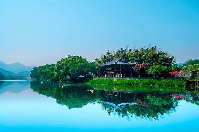 영벽정은 계절에 따라서 형형색색의 옷으로 갈아입는 장소입니다. 맑게 흐르는 지석강물과 낮고 소담한 섬 위로 울창하게 자라난 나무와 고즈넉한 풍광의 누각이 인상적인 명소입니다.