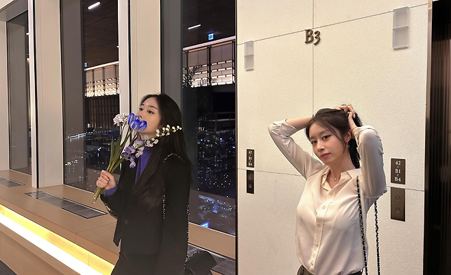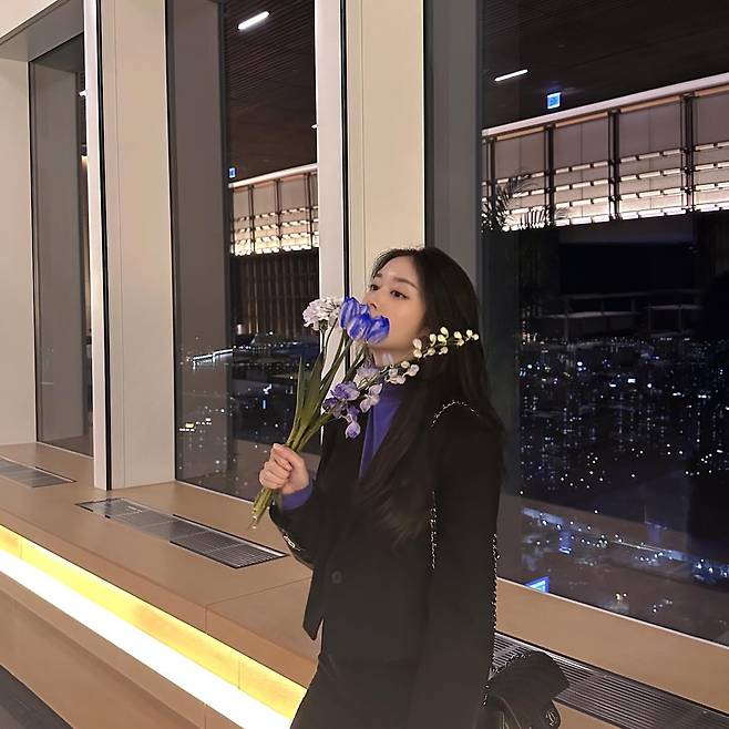 두 번째 사진에서 지연은 블랙 재킷과 보라색 상의를 매치한 세련된 모던룩을 선보이고 있다. 어두운 밤 도시 풍경을 배경으로 보라색 꽃다발을 들고 있는 모습이 로맨틱한 분위기를 자아낸다. 특히 블랙 재킷의 심플한 실루엣과 보라색 상의의 조화가 도시적인 세련미를 연출하고 있으며, 긴 생머리 스타일링으로 여성스러움을 더했다. 높은 층에서 내려다보이는 야경과 함께 고급스러운 분위기를 완성하고 있다.
