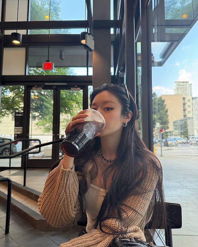 네 번째 사진에서는 베이지색 니트 카디건과 화이트 이너를 매치한 편안한 데일리룩을 선보이고 있다. 스타벅스 음료를 마시는 모습이 자연스러운 일상을 담아내고 있다. 니트 카디건의 풍성한 소매 디테일이 포근한 느낌을 주며, 심플한 액세서리와 함께 꾸미지 않은 듯한 세련된 스타일을 연출하고 있다. 창가의 밝은 채광과 어우러져 편안하면서도 스타일리시한 모습을 보여준다.