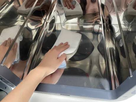 먼저, 전원코드를 콘센트와 분리한 뒤 스팀타월을 젖병소독기에 넣고, 문을 닫고 1분 정도를 기다려줘야 합니다. 뜨거운 수증기가 내부의 얼룩과 물때를 불리는 과정이며, 1분 뒤에는 문을 열고 스팀타월로 내부 바닥을 가볍게 닦아줍니다.