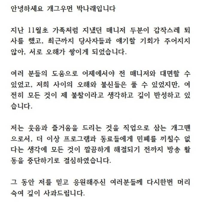 또 박나래는 “저는 웃음과 즐거움을 드리는 것을 직업으로 삼는 개그맨으로서, 더 이상 프로그램과 동료들에게 민폐를 끼칠 수 없다는 생각에 모든 것이 깔끔하게 해결되기 전까지 방송 활동을 중단하기로 결심했다”고 알렸습니다.