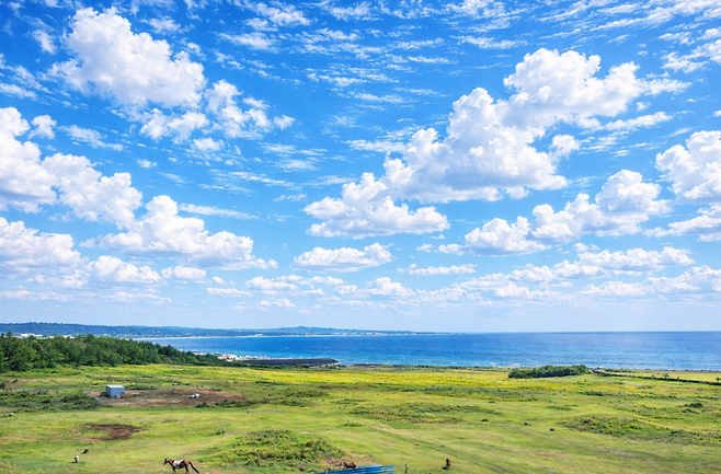 이곳에 서면 가장 먼저 눈에 들어오는 것은 넓게 펼쳐진 초지와 바다 풍경입니다. 제주 특유의 낮은 구릉과 풀밭이 이어지고 그 뒤로 푸른 바다가 이어지며 마치 한 폭의 풍경화를 보는 듯한 장면을 만들어 냅니다.
