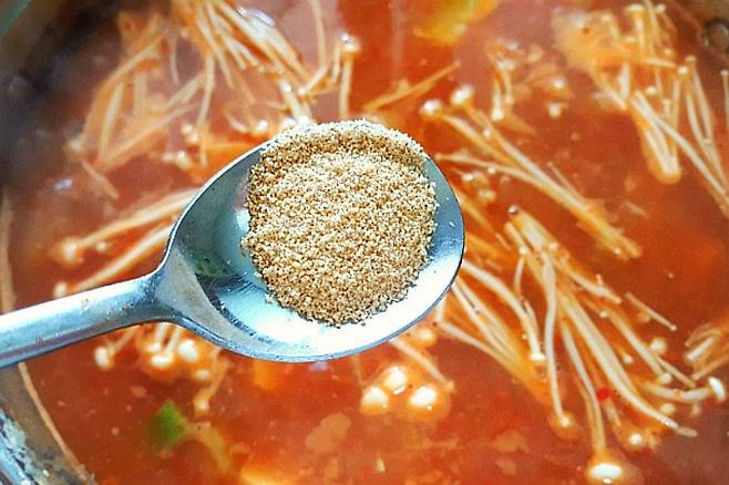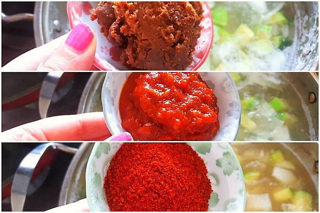 그다음 일반 수저로 된장 2:쌈장 2:고춧가루 1 물에 풀어주시면 되는데요. 고깃집 된장찌개의 비밀은 바로 '쌈장'에 있답니다. 된장과 쌈장, 고춧가루 비율은 본인이 끓이시는 찌개 양에 따라 비율을 높이시거나 낮춰주시면 됩니다.