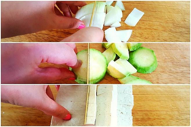 먼저 양파, 호박을 사각모양으로 썰어주세요. 두부는 반모만사 용하셔도 되지만 좋아하시면 다 넣으세요.