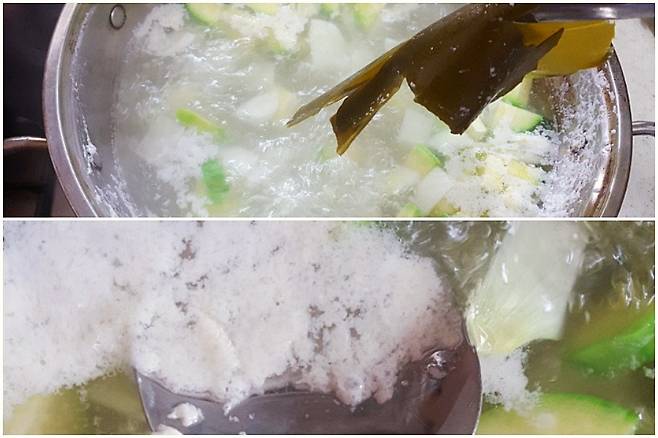팔팔 끓으면 다시마를 꺼내주시고요. 끓이면서 생기는 거품을 걷어내 주시면 훨씬 깔끔하게 끓여진답니다.