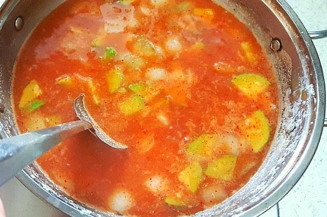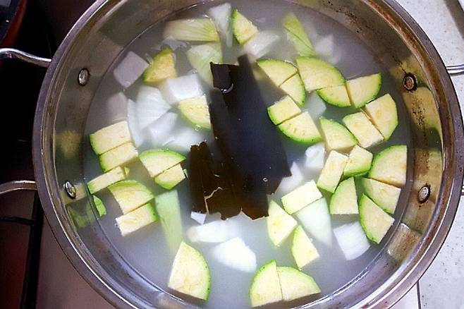 쌀뜨물에 양파, 호박, 다시마를 넣고 센 불에서 팔팔 끓여 줍니다. 쌀뜨물과 다시마가 없다면 멸치로 국물육수를 내셔도 됩니다.