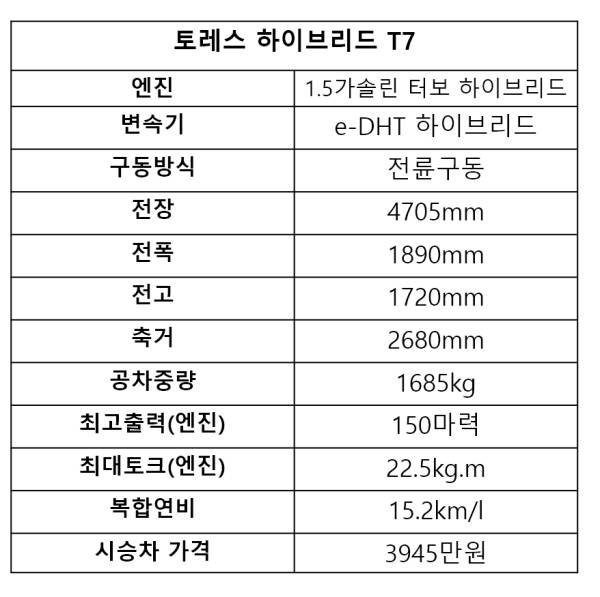 토레스 하이브리드는 가솔린 모델과 달리 BYD의 1.5 가솔린 터보 엔진을 하이브리드에 맞게 개량했다. 최고출력 150마력, 최대 토크는 22.5kgf.m를 발휘한다. 토레스 하이브리드의 가장 큰 특징은 경쟁 하이브리드 모델 중에 가장 용량이 큰 배터리가 적용된 점이다.