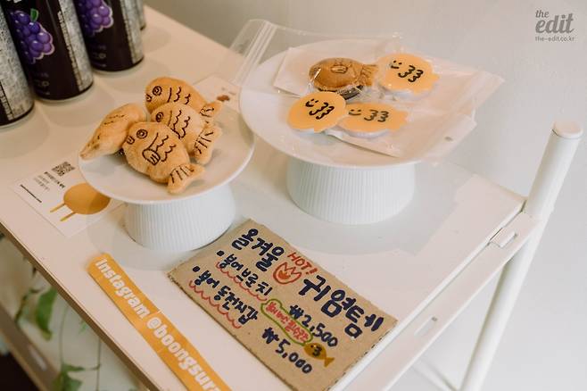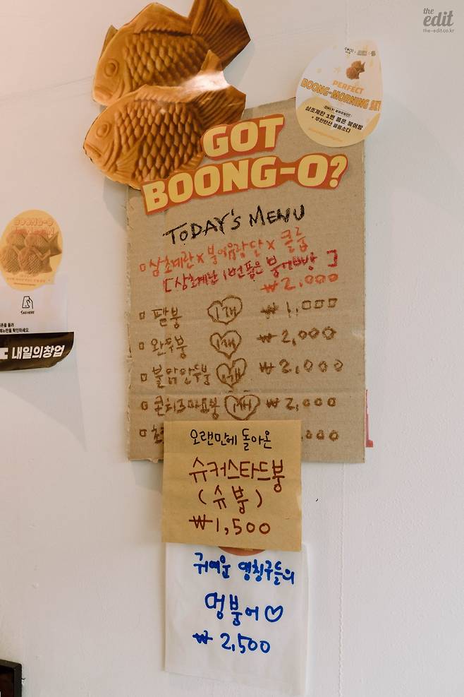 메뉴는 총 여섯 가지(강아지를 위한 메뉴도 하나 있다). 삼초계란 1번 품은 붕어빵, 팥붕, 완두붕, 불닭만두붕, 콘치즈만두붕, 슈커스터드붕 등. 아쉽게도 초코붕은 내가 방문한 날에는 판매하지 않았다.