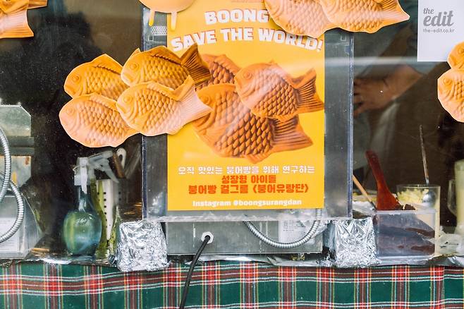여기가 바로 붕어유랑단 팝업스토어다. 팝업이기 때문에 간판이 없다. 언뜻 봐서는 뭘 하는 곳인지도 모르겠지만 가까이에서 보면 여기저기 붕어빵으로 도배해 놓은 게 보인다. 누가 봐도 붕어빵 가게다.