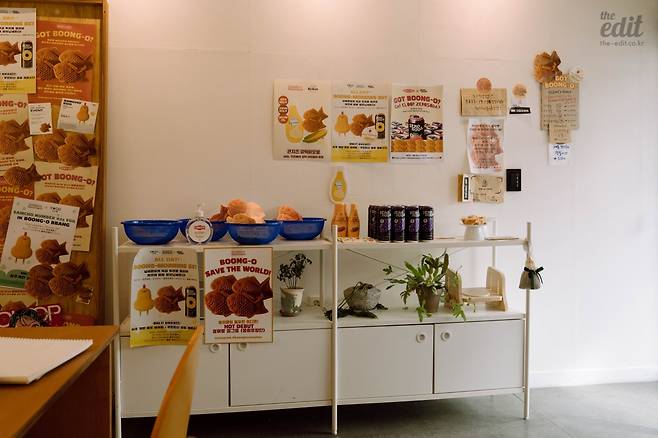 매장은 아담하다. 세 명의 붕어빵 로스터가 붕어빵을 굽고 있었고, 한쪽 벽에는 메뉴판, 굿즈가 있었다. 레트로한 과일 바구니에 종이 붕어빵을 담아놓은 걸 보니 김씨네 과일가게가 떠오르기도 했다.