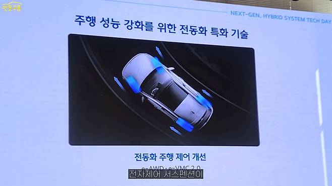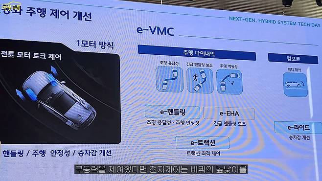 e-라이드 기술은 과속 방지턱 통과 시 브레이크와 액셀러레이터의 조합을 통해 승차감을 개선한다. 한편 e-핸들링 기술은 코너링 상황에서 토크를 적절히 제어하여 안전한 주행을 가능하게 한다.